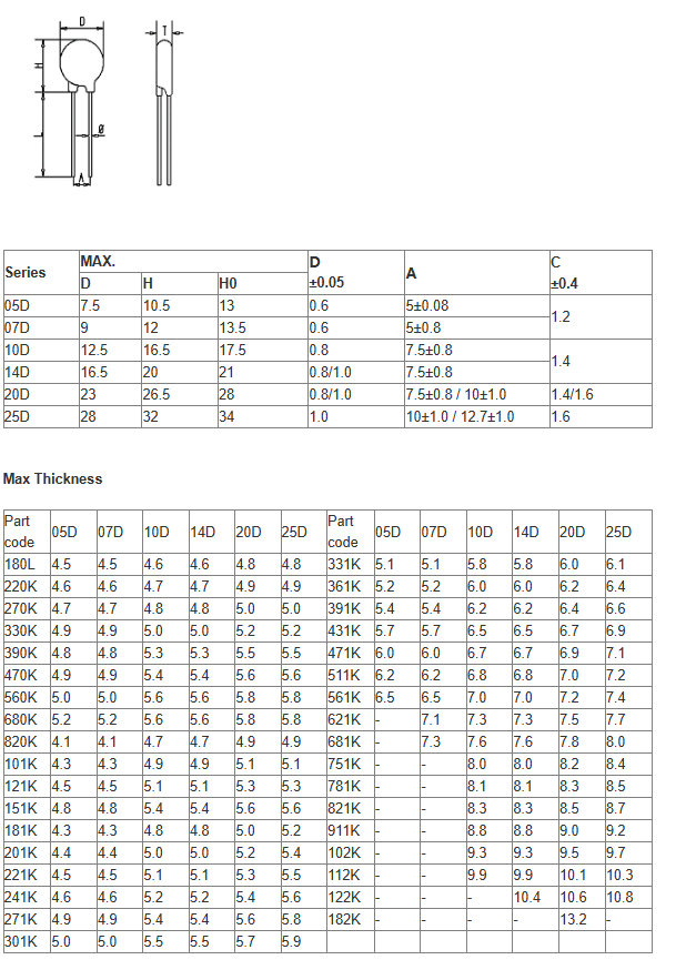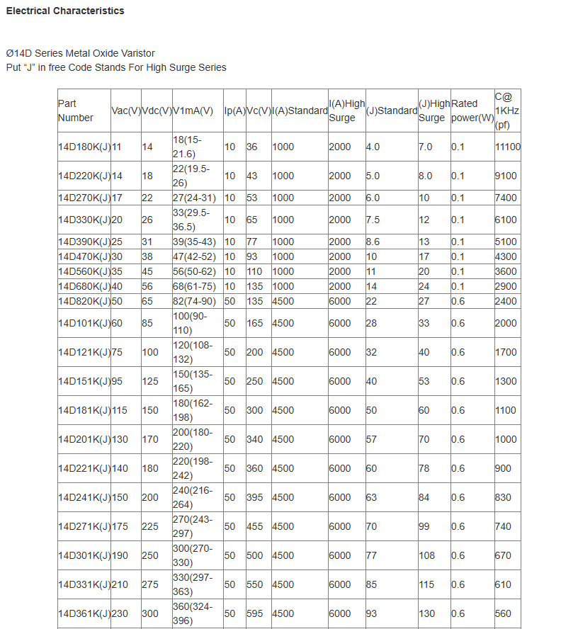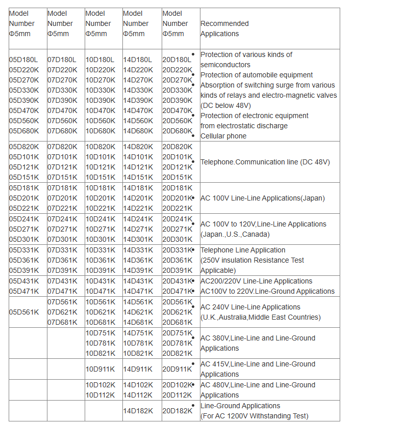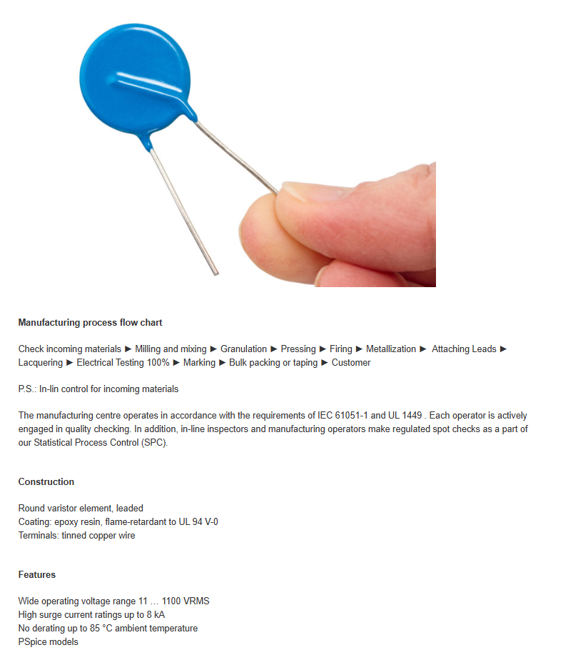 Ao littel Metal Oxide Varistors provide reliable and economical protection against high voltage transients and surges which may be produced, for example, by lightning, switching or electrical noise on AC or DC power lines. They have the advantage over transient suppressor diodes in as much as they can absorb much higher transient energies and can suppress positive and negative transients. When a transient occurs, the varistor resistance changes from a very high stand-by value to a very low conducting value. The transient is thus absorbed and clamped to a safe level, protecting sensitive circuit components. Varistors are manufactured from a non-homogeneous material, giving a rectifying action at the contact points of two particles. Many series and parallel connections determine the voltage rating and the current capability of the varistor.